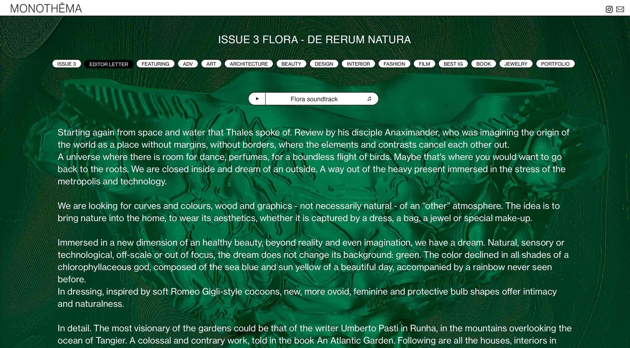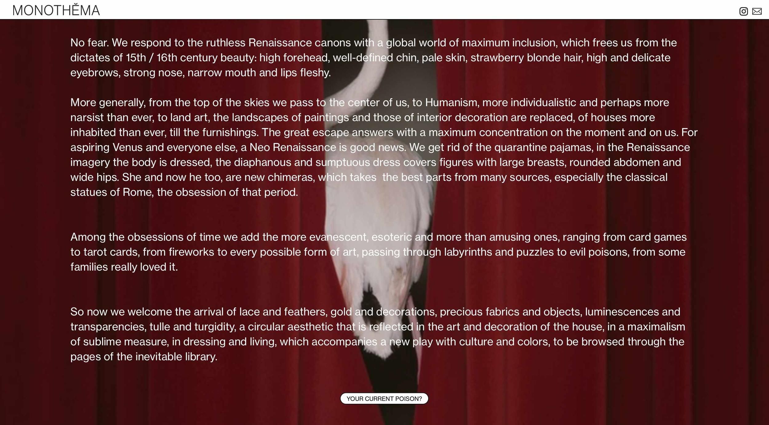 Site for Monothema Magazine. A broader storytelling on the major aesthethic trends as the result of research and forecast. One Theme at a time, analysed through our lifestyle Monothema filters. A spontaneous low-tech approach for warm, real and true content.